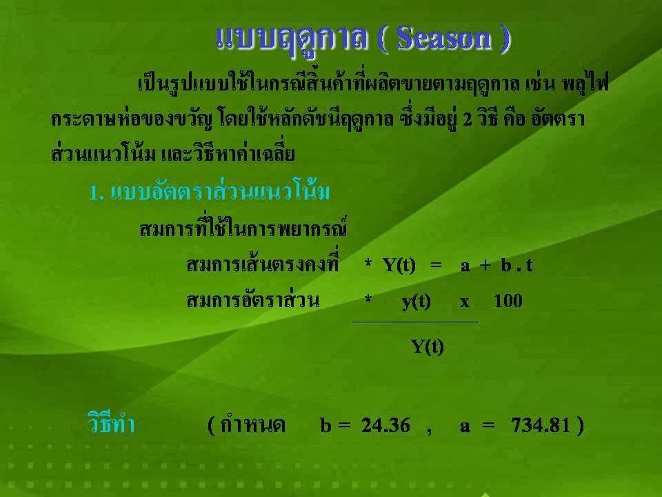 การพยากรณ์มี 12 วิธีแต่ในที่นี้จะสอนที่นิยมในอุตสาหกรรม 3-4 วิธี มีเนื้อหาดังสไลด์ต่อไปนี้